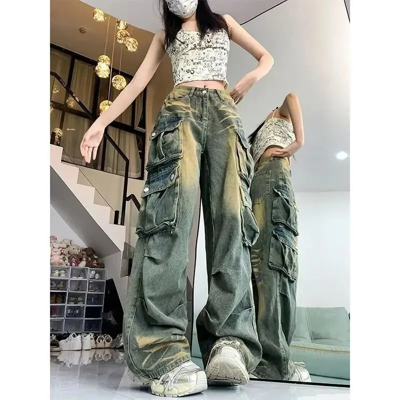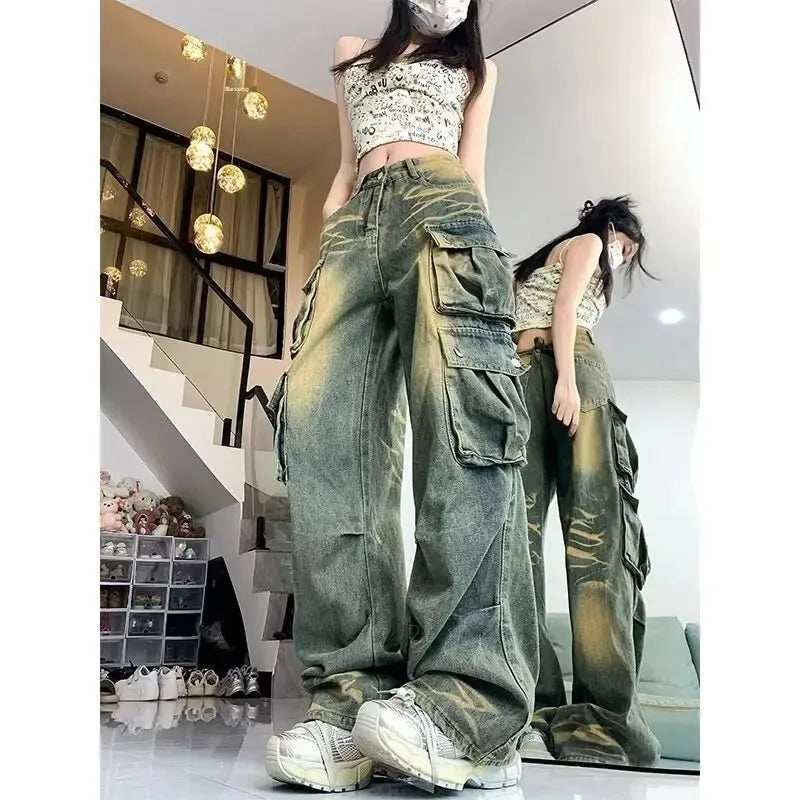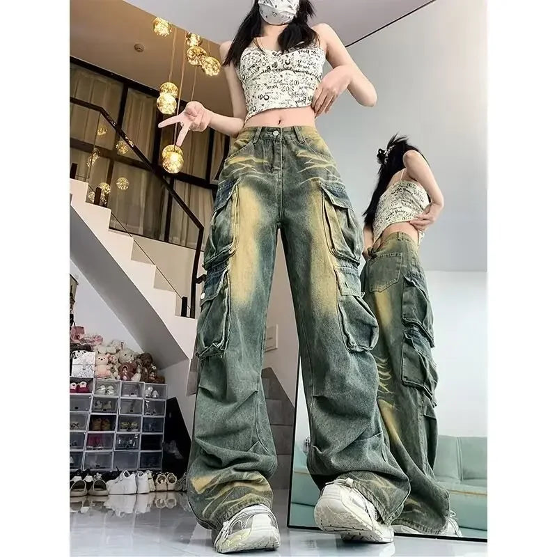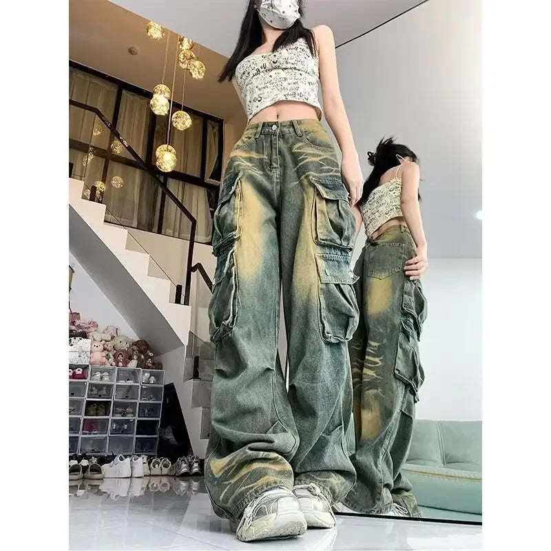 Deze high-waist cargo jeans heeft een unieke vintage wassing met een opvallende geel-groene tint. Het model combineert een losse pasvorm met brede pijpen en meerdere cargozakken, wat zorgt voor een stoere en praktische streetwear look.