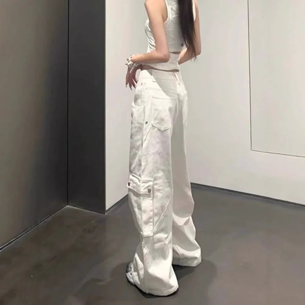Deze high-waist cargo jeans in wit combineert een losse pasvorm met een moderne streetwear uitstraling. Het model heeft een recht, wijd silhouet en praktische cargozakken, waardoor het zowel comfortabel als stijlvol is.