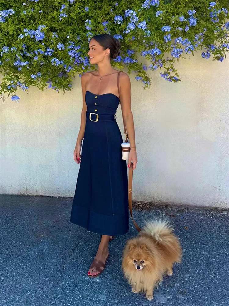 Strapless denim jurk met knoopdetails aan de voorzijde en een elegante ceintuur in de taille.