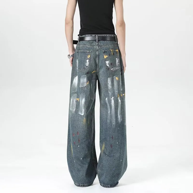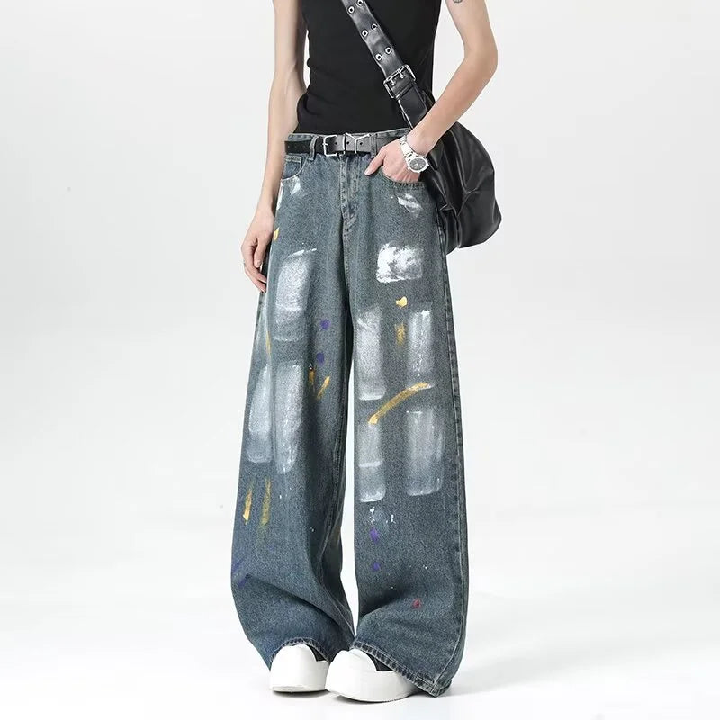 Deze wide-leg jeans valt direct op door de artistieke verfspatten in wit, geel en paars die de broek een creatieve en unieke uitstraling geven. Het model heeft een losse pasvorm en is uitgevoerd in stevig denim met medium stretch.