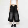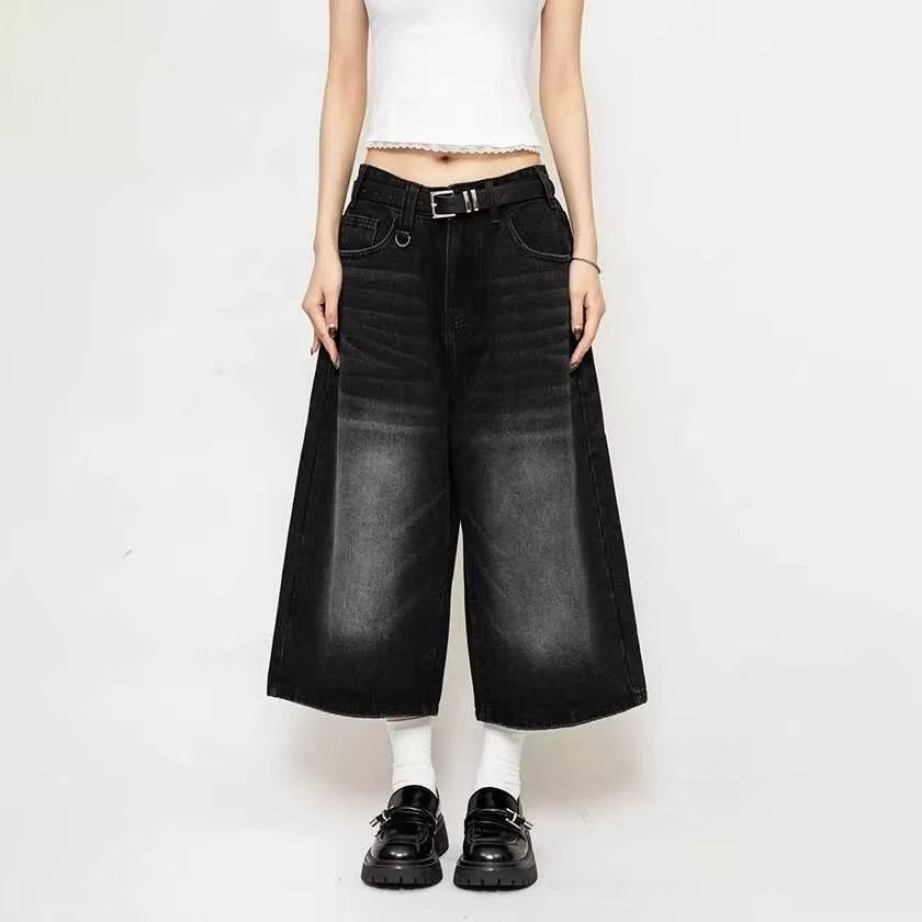 Zwarte denim culotte-short met wijde pijpen en faded details voor een stoere casual look. Hoog getailleerd model met losse pasvorm, perfect voor lente en zomer.