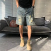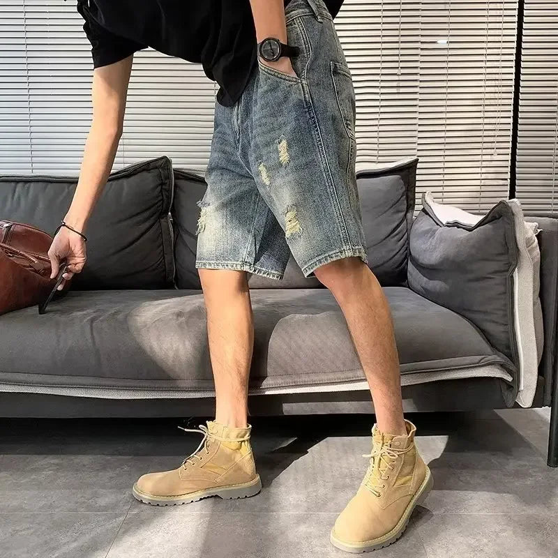Blauwe distressed denim short voor heren met losse pasvorm en rechte snit voor een relaxte, zomerse look. Lichtgewicht materiaal zorgt voor optimaal comfort tijdens warme dagen.