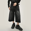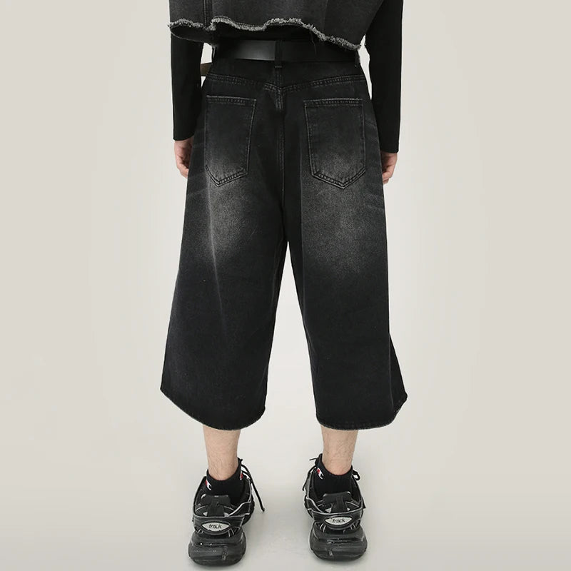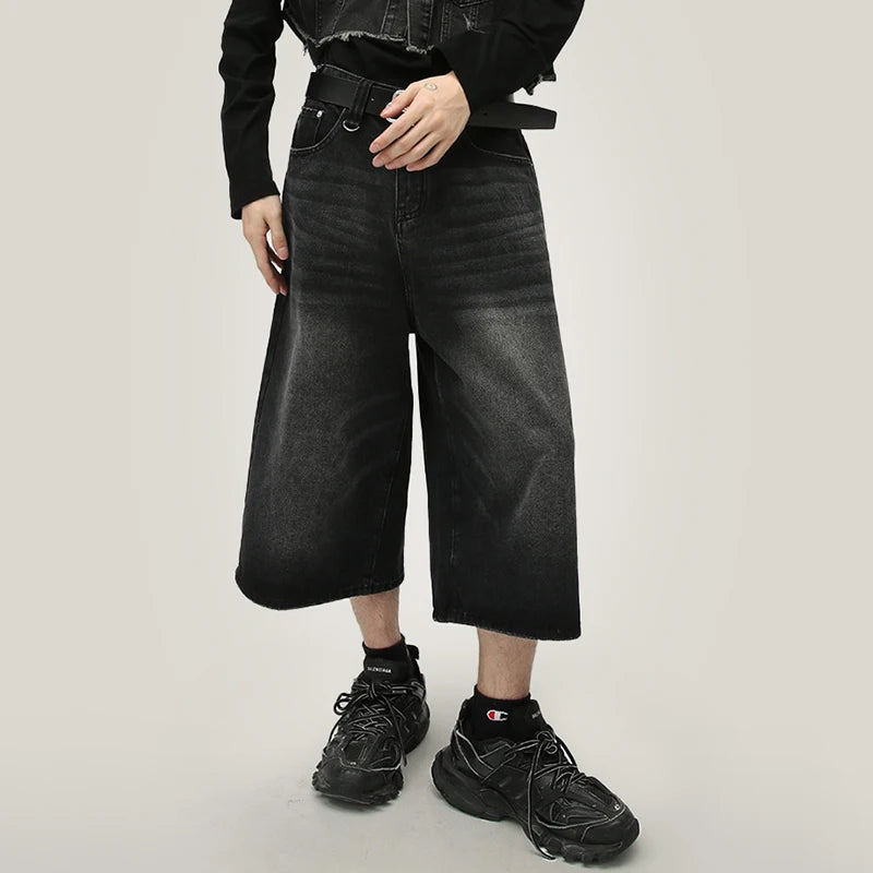 Zwarte wide-leg denim short voor heren met middelhoge taille en knoopsluiting. Losvallend model met subtiel gewassen effect, ideaal voor een comfortabele en casual zomerse stijl.