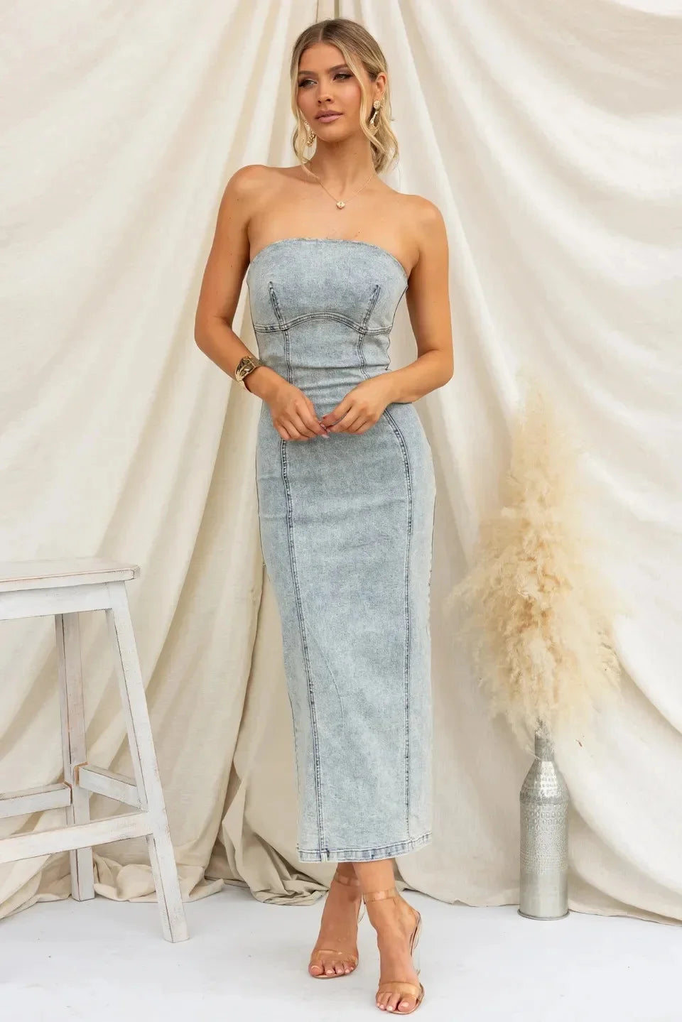 Strapless denim-look jurk in een slanke pasvorm die de vrouwelijke vormen accentueert.