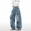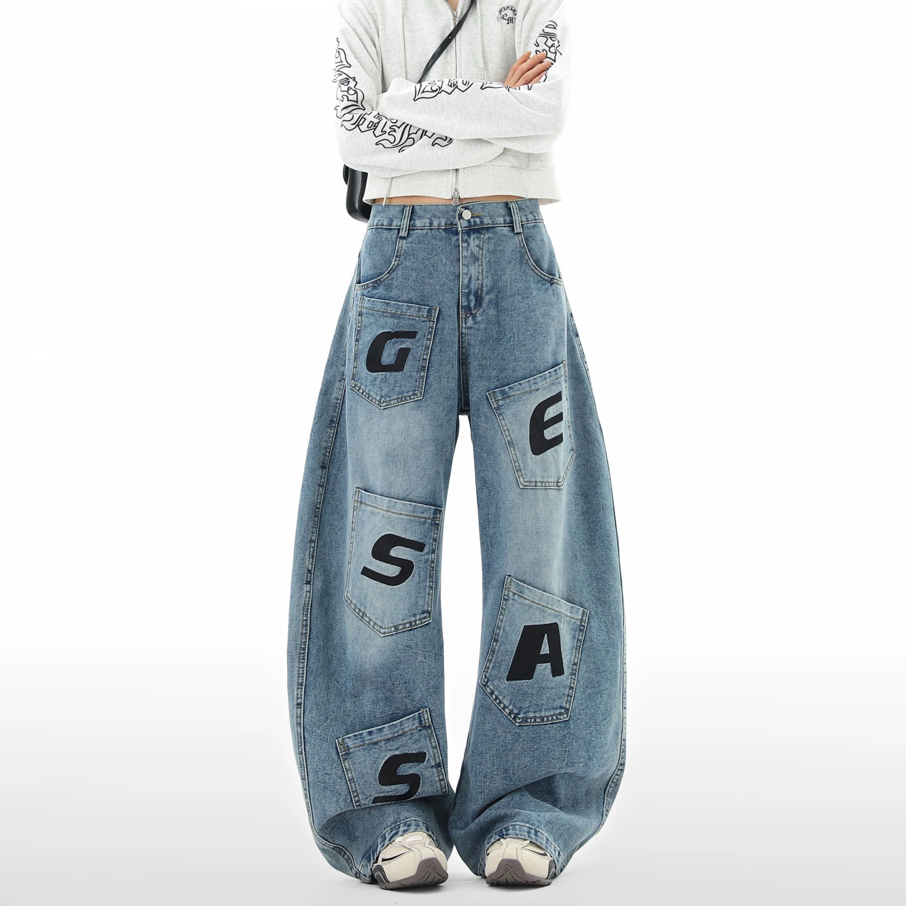 Blauwe low-waist baggy jeans met opvallende patches in contrasterende tinten, bedrukt met grote zwarte letters. Het unieke ontwerp met geometrische vormen maakt deze jeans een echte eyecatcher en geeft hem een uitgesproken streetwear vibe.