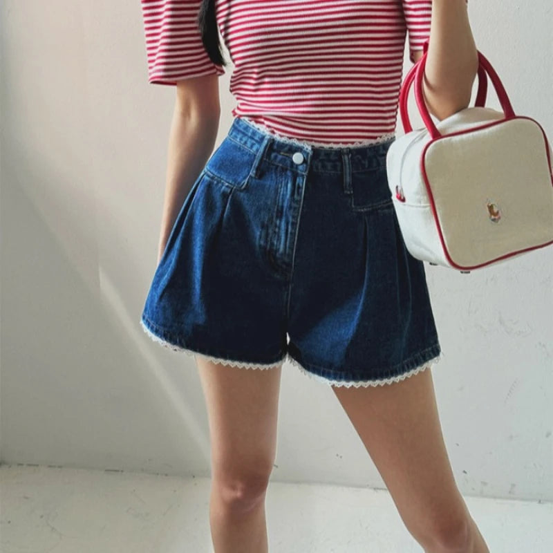 Donkerblauwe denimshort met hoge taille, wijde pijpen en elegante kanten afwerking voor een vrouwelijke casual look. Regular fit, ideaal voor lente en zomer.