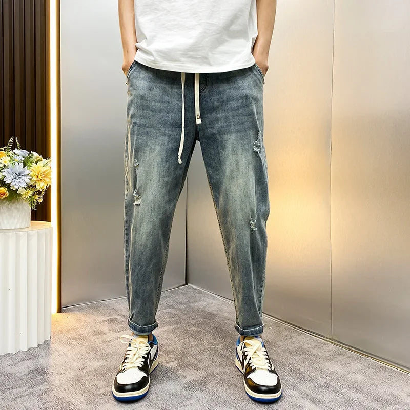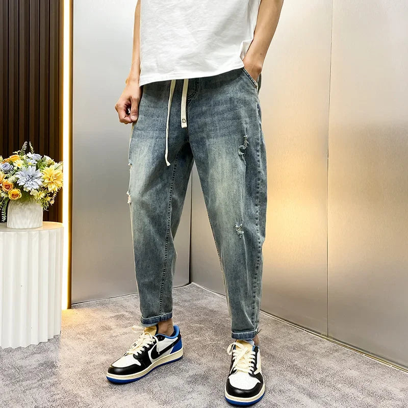 Deze loose fit harem jeans voor heren combineert een vintage uitstraling met een comfortabel ontwerp. Het carrot model met elastische taille en enkelhoogte pasvorm zorgt voor veel bewegingsvrijheid en een relaxte look.