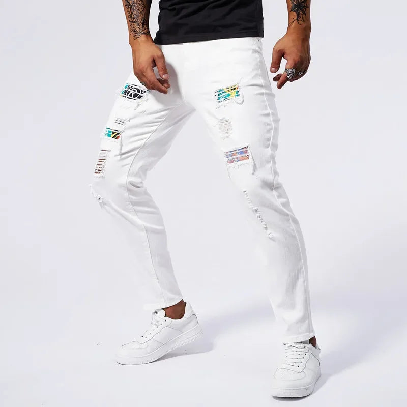 Deze witte slim fit jeans voor heren valt op door zijn ripped details met kleurrijke inzetstukken. Het smalle ontwerp benadrukt de lichaamsvormen en geeft een moderne uitstraling, terwijl de denimstof zorgt voor duurzaamheid en draagcomfort.