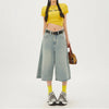 Lichtblauwe denim culotte-short met wijde pijpen en subtiele distressed details voor een trendy streetwearlook. Hoog getailleerd model met losse pasvorm, ideaal voor lente en zomer.