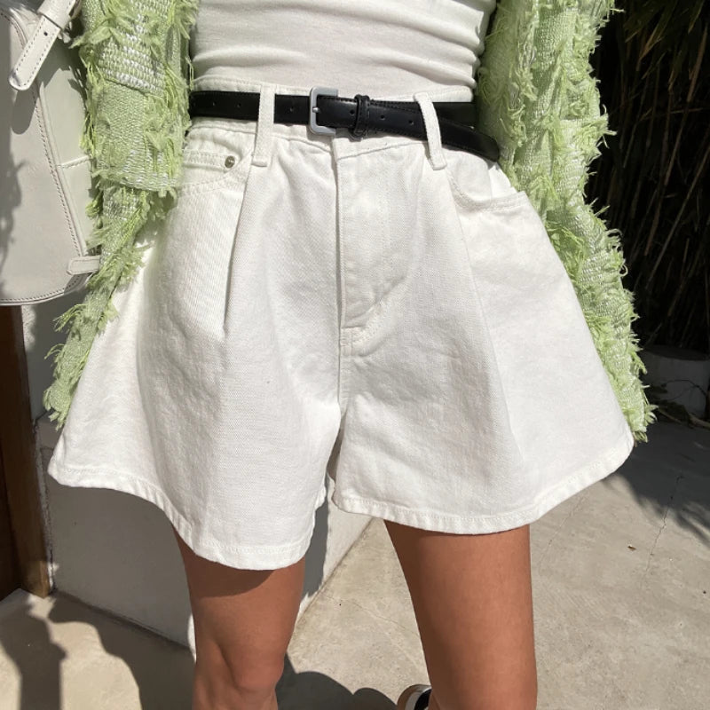 Vintage witte denim short met hoge taille en knoopsluiting voor een elegante retrolook. Losvallend model dat licht en comfortabel is, perfect voor de lente en zomer.