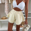 Lichtgele denimshort met hoge taille en rafelige zoom voor een speelse en vrouwelijke uitstraling. Regular fit ontwerp, perfect voor zomerse dagen in casual Koreaanse stijl.