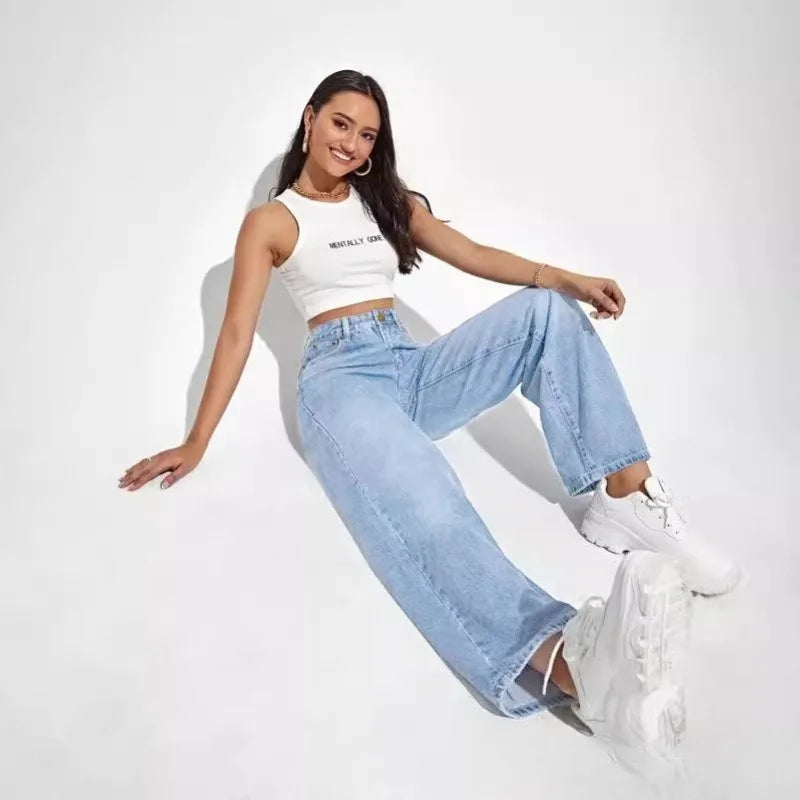 Deze high-waist jeans in lichtblauw denim is een tijdloos en veelzijdig kledingstuk. Het model heeft een wijde, rechte pijp die zorgt voor een elegante en comfortabele pasvorm.