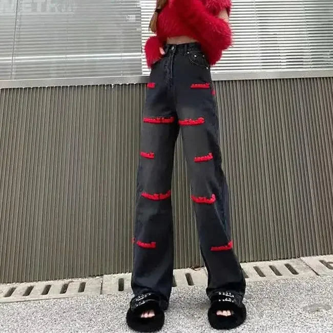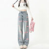 Deze lichte denim jeans valt op door de unieke roze borduursels met tekst die over de pijpen zijn verdeeld.