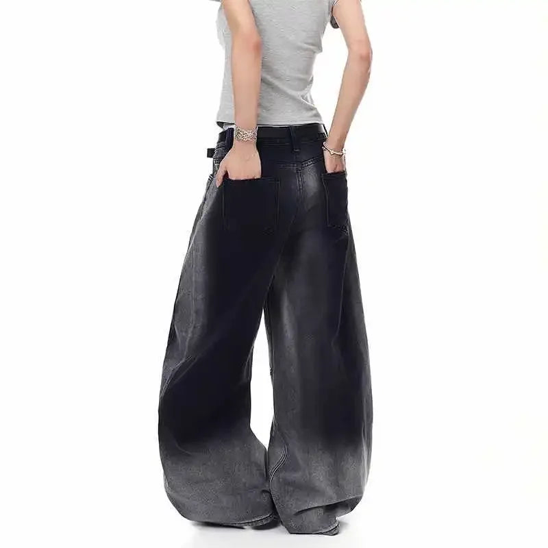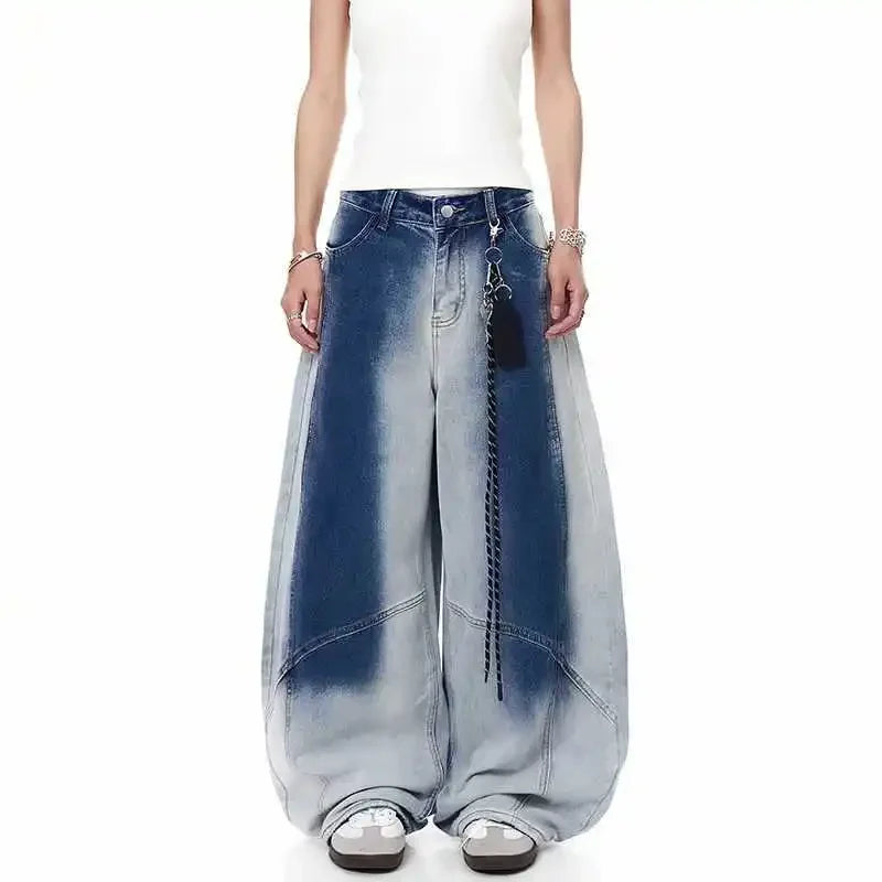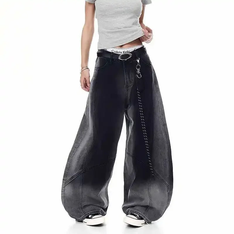 Unieke scimitar-cut jeans met high waist en extreem wijde pijpen. Het bijzondere snijpatroon in combinatie met de heavy washed afwerking geeft deze jeans een edgy, bijna futuristische uitstraling.